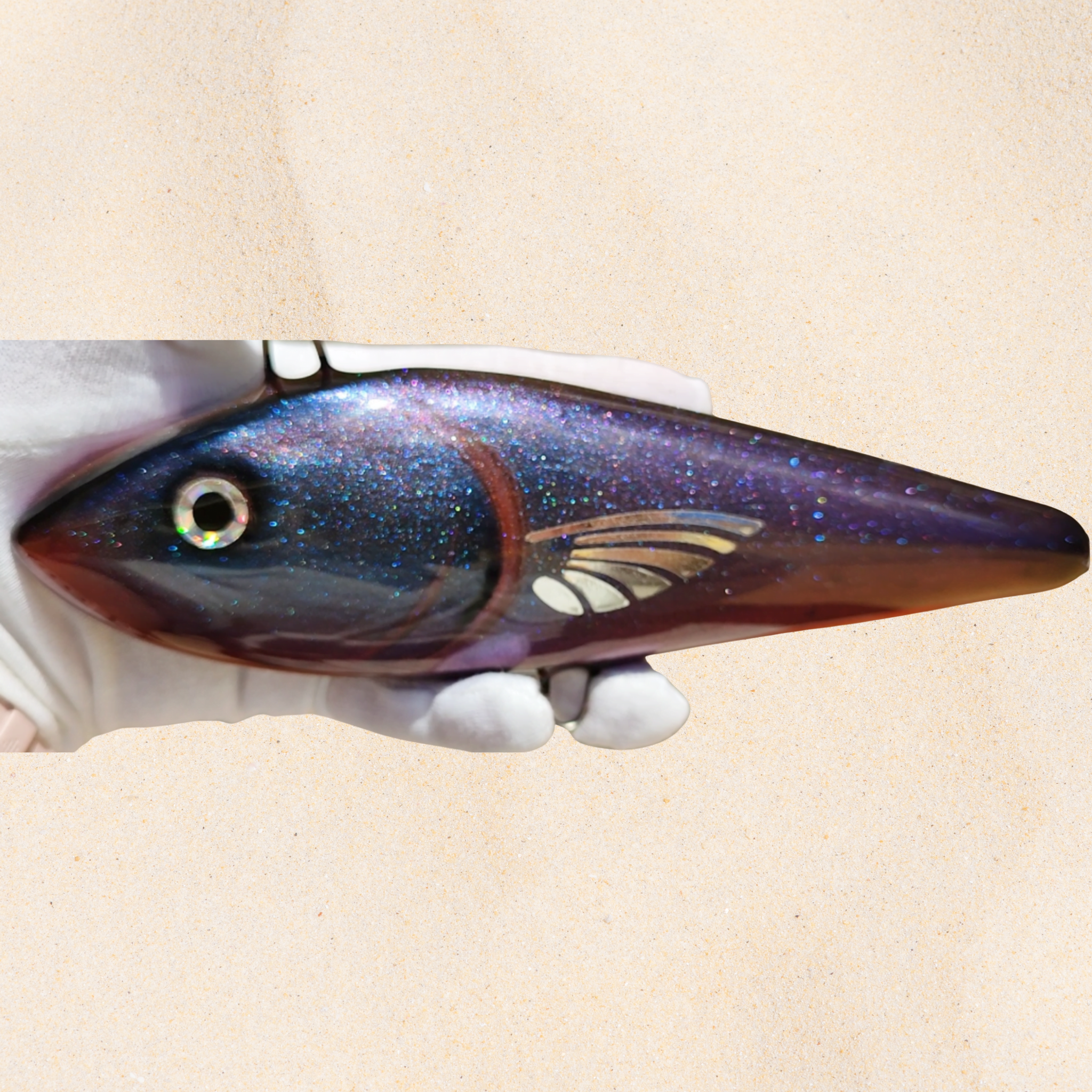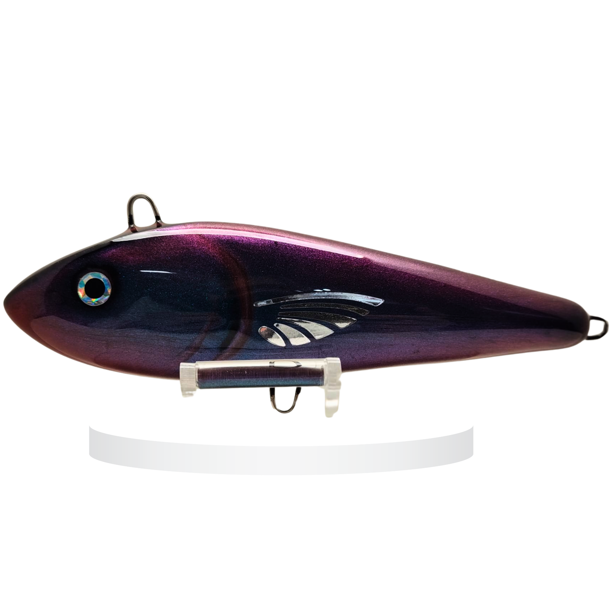El acabado en tonos púrpura metalizado con destellos azulados crea un brillo hipnótico bajo el agua, actuando como un potente imán visual para especies como el atún, bacoreta, serviola y peto.