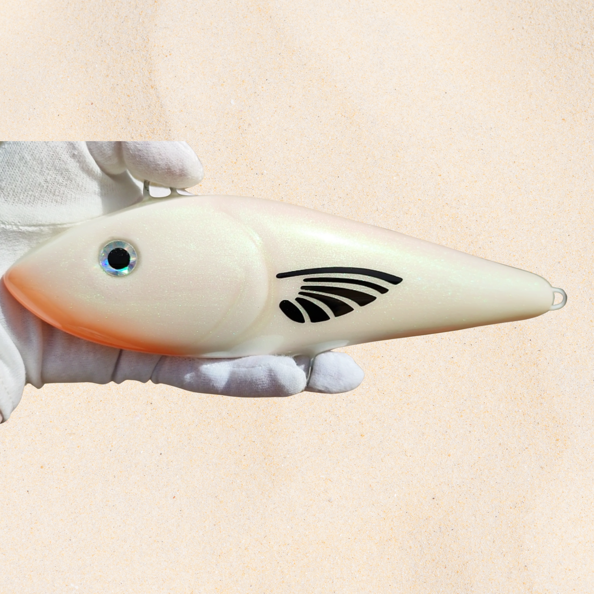 Con 32 cm de largo y 1200 gramos de peso, este señuelo hundido está diseñado para trabajar entre 5 y 12 nudos, ofreciendo un movimiento realista que simula una presa herida.